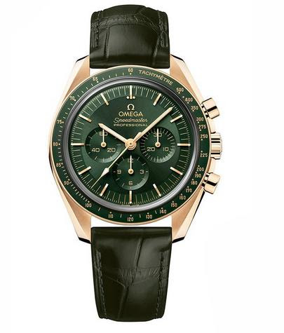 Omega Speedmaster Professional Moonwatch Watch 310.63.42.50.10.001(Replica Omega Speedmaster), this watch is made of Moonshine 18K gold, this material is a new 18K gold launched by the brand to commemorate the 50th anniversary of the first moon landing. The case diameter of the watch is 42 mm, with a "stepped" dial treated with green PVD, showing the polishing effect of the sun's rays, and the hands continue the style of the moon watch hands. The three sub-discs are evenly arranged on the dial. This moon watch is equipped with the Omega 3861 Master Chronometer movement.Omega Replica Watches